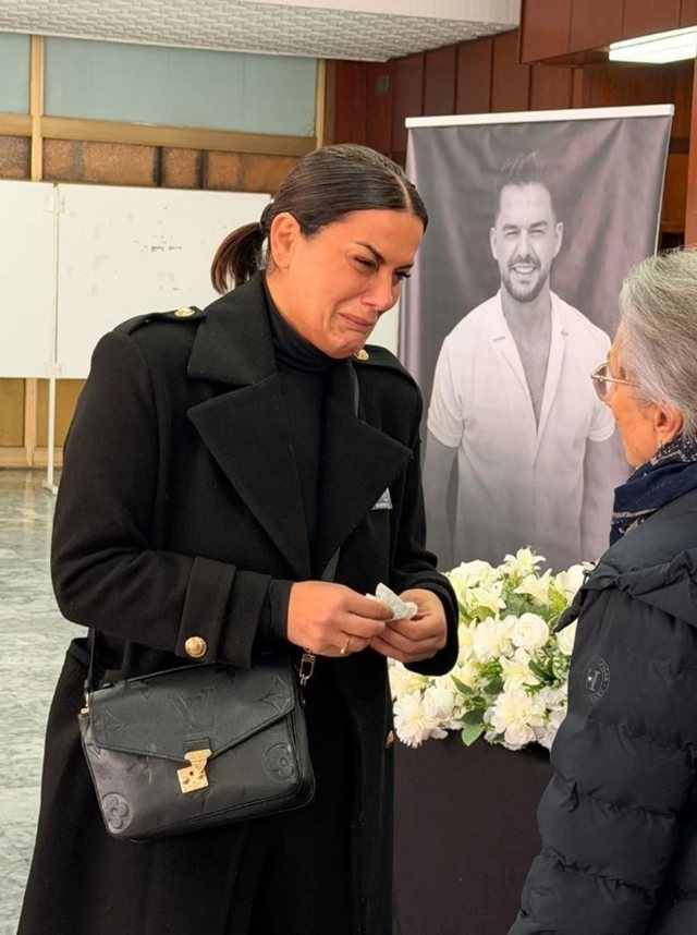 E veshur me rroba të zeza, ajo qëndroi pranë të pranishmëve, duke marrë ngushëllimet dhe duke mbajtur një shami në dorë, ndërsa emocionet nuk i lejuan të fshihej pas një qetësie të jashtme.