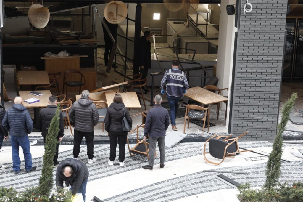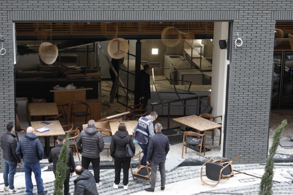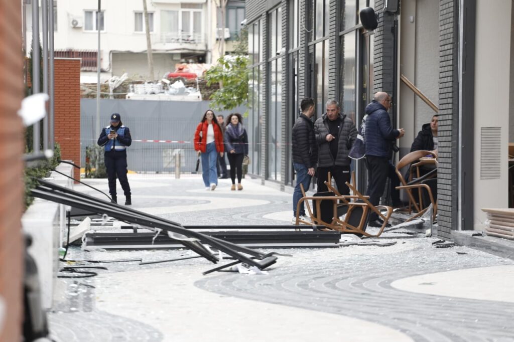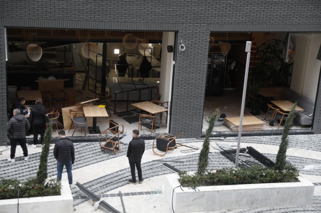 Në pamjet e sigururar për VoxNews, xhama të thyera dhe karrige të shkatërruara pranë vendit të ngjarjes i cili është dëmtuar plotësisht ga shpërthimi i fortë.
