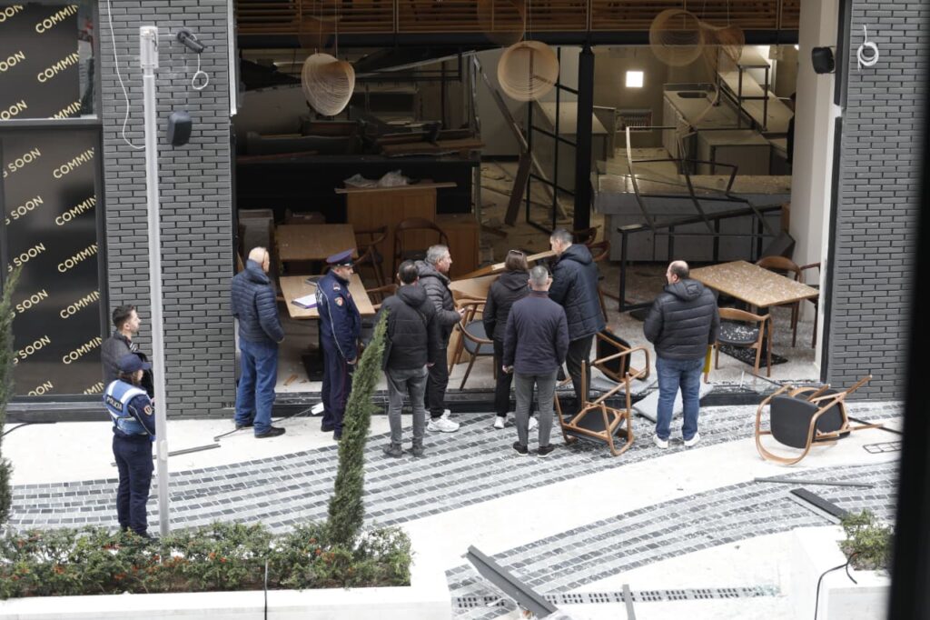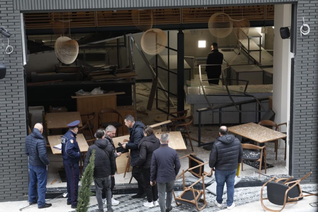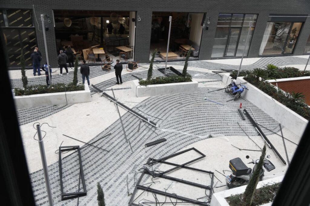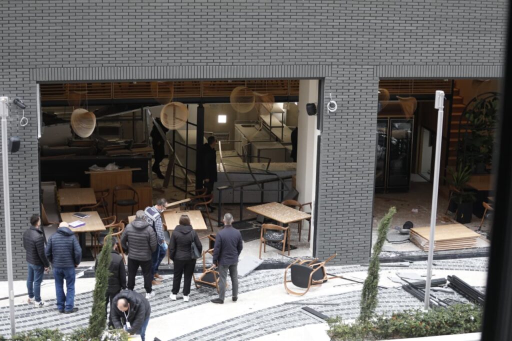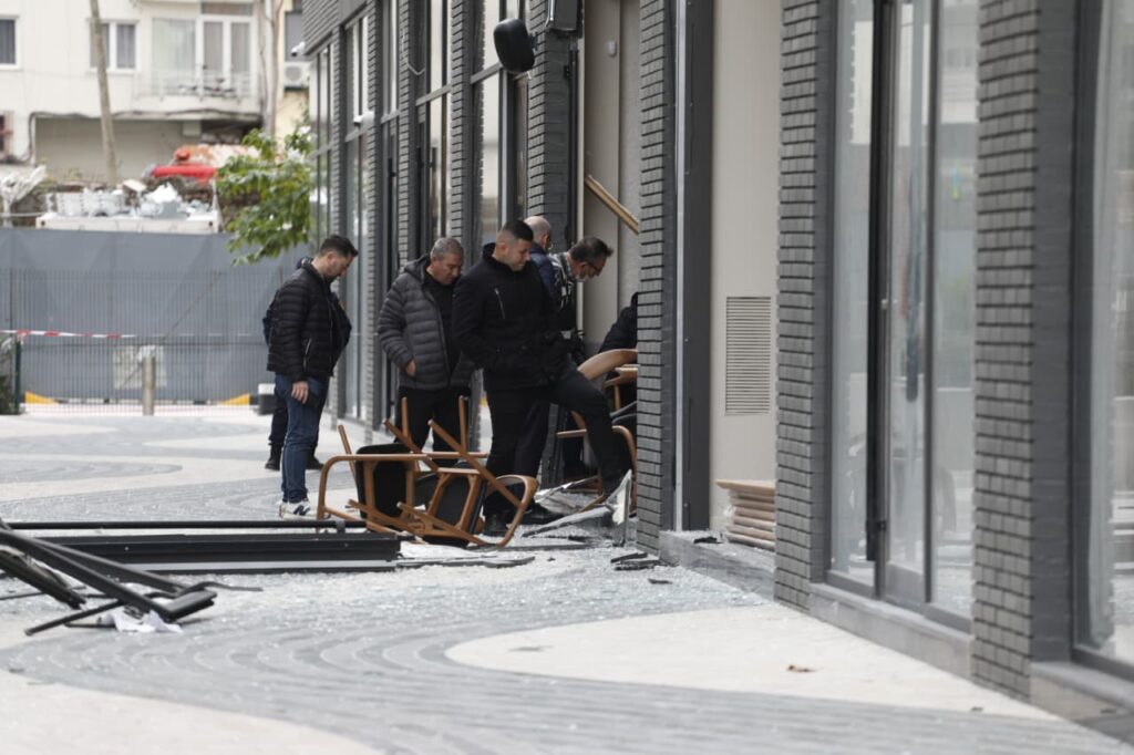 Në pamjet e sigururar për VoxNews, xhama të thyera dhe karrige të shkatërruara pranë vendit të ngjarjes i cili është dëmtuar plotësisht ga shpërthimi i fortë.