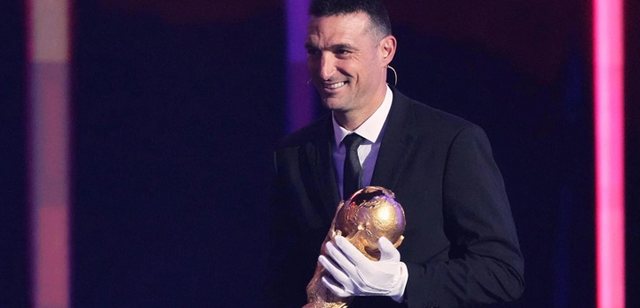Por ndryshe nga paraardhësi i tij, Scaloni mbante doreza të bardha. Trajneri argjentinas e mbajti trofeun me vëmendjen dhe përkushtimin më të madh. "Mbaj mend finalen kundër Francës: ishte një ndeshje e paharrueshme", i tha ai Heidi Klum, prezantueses së mbrëmjes.