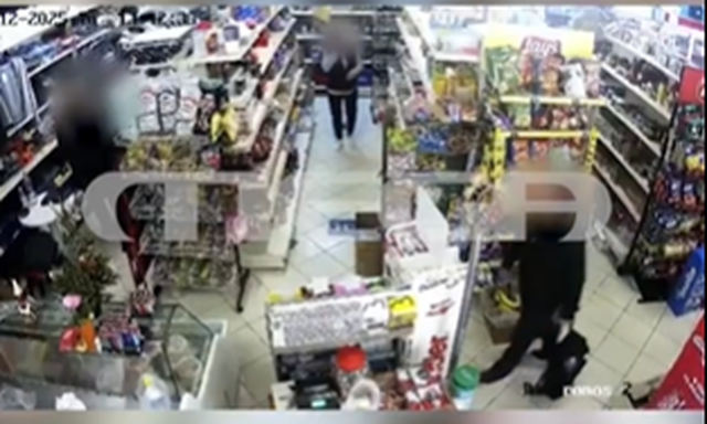 Në video shihet momenti kur gruaja shqiptare përpiqet të fshihet pas rafteve të minimarketit, ndërsa 55-vjeçari e ndjek, duke injoruar klientët në dyqan.