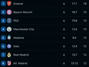 Arsneali është perfekt me 6 fitore dhe 18 pikë, duke siguruar kualifikimin dhe një hap sigurimit të “Top 8”. Ai ndiqet nga Bayerni me 15 pikë dhe më pas vijnë PSG, City e Atalanta me nga 13 pikë. Interi, Reali e Atletico mbyllin Top 8.