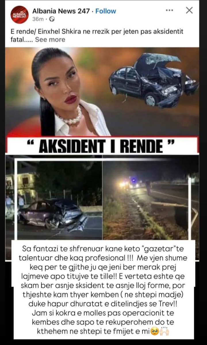 Banorja e edicionit të parë të Big Brother Albania VIP, aktualisht moderatore, Einxhel Shkira ka reaguar sot pas lajmeve që kanë qarkulluar se kishte pësuar një aksident të rëndë.