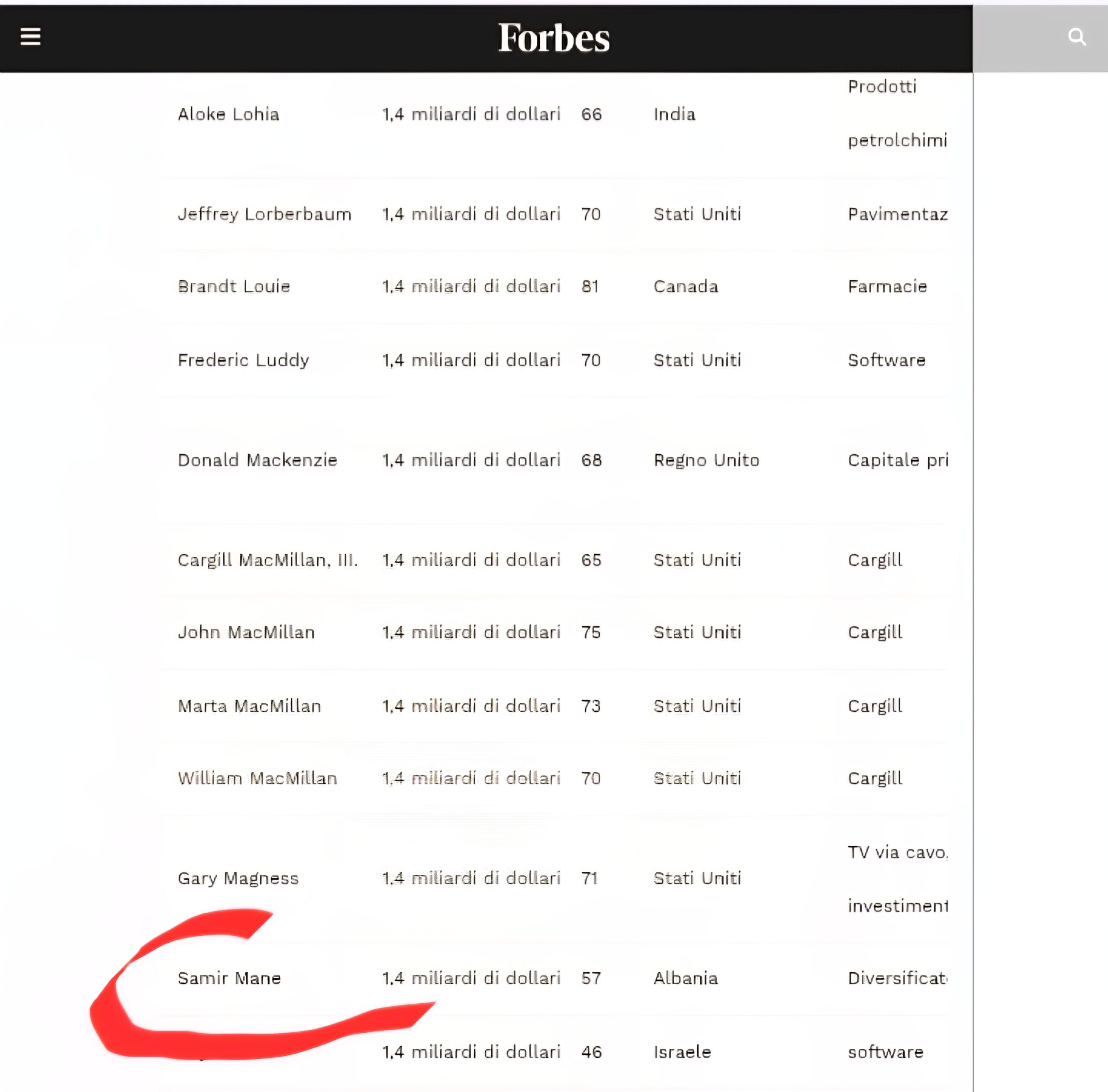 Sipas listës më të fundit të Forbes që analizoi sot noa.al, Samir Mane është shqiptari i vetëm dhe më i pasuri që është përfshirë në renditjen globale të të pasurve (billionaires) në botë. Ai renditet në vendin e 2356 mes 2933 miliarderëve në gjithë globin.