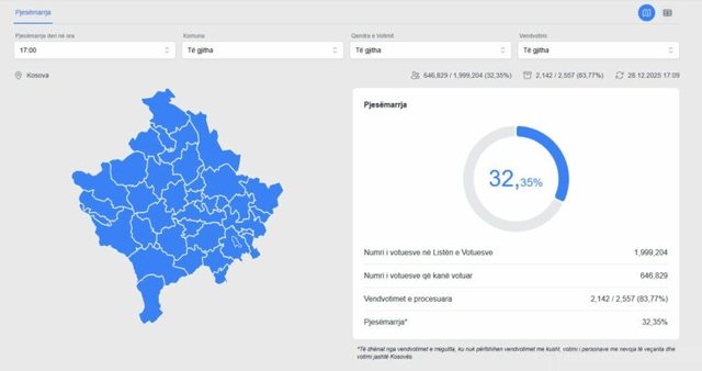 KOSOVË- Më pak se dy orë na ndajnë nga mbyllja e procesit të votimit në Kosovë për zgjedhjet parlamentare. Bazuar në të dhënat e Komisionit Qendror të Zgjedhjeve, deri në orën 17:00, të drejtën e votës e kanë ushtruar 646 mijë e 829 qytetarë.