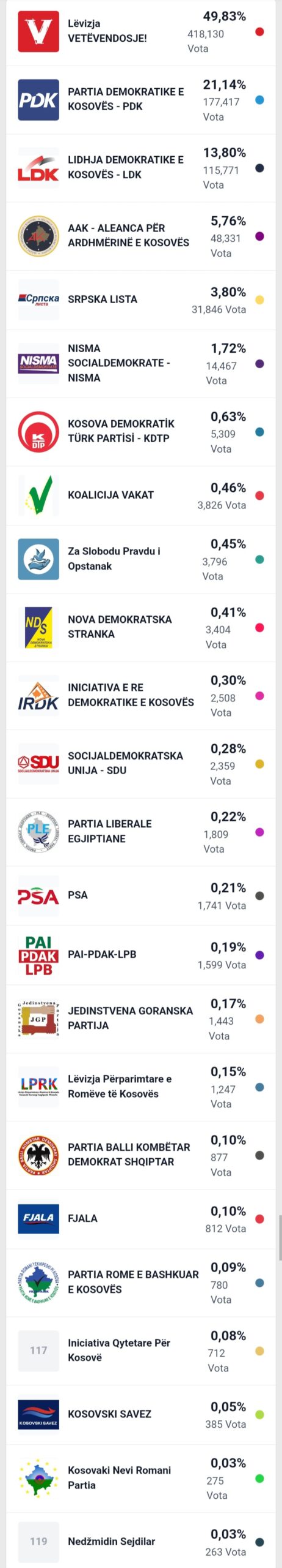 Sipas të dhënave të publikuara nga Komisioni Qendror i Zgjedhjeve, me rreth 81% të votave të numëruara, Lëvizja Vetëvendosje e udhëhequr nga Albin Kurti ka siguruar gati 50% të votave në nivel vendi.