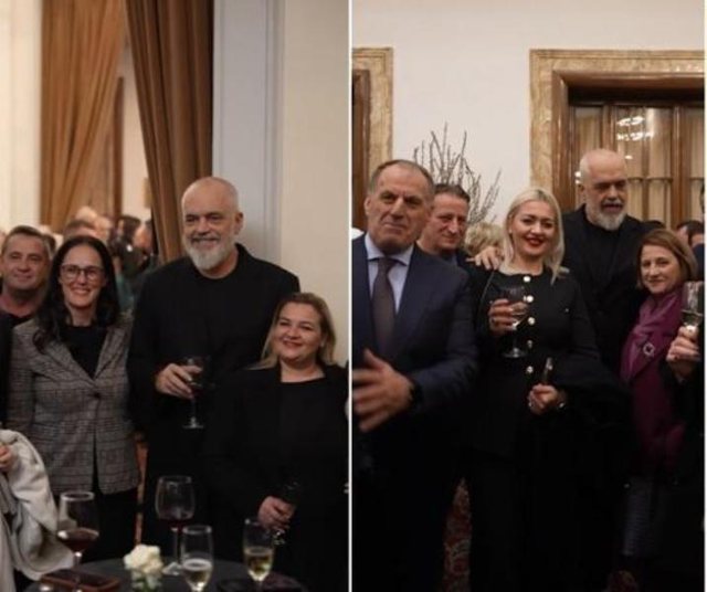 Në pamjet e shpërndara, Rama shfaqet i buzëqeshur, duke trokitur gotat dhe përqafuar të pranishmit.