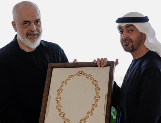 EMIRATET E BASHKUARA ARABE- Kryeministri Edi Rama ka ndarë pamjet nga takimi me Presidentin e Emirateve të Bashkuara Arabe, Sheikun Zayed. Ky i fundit në emër të vendit që drejton i ka akorduar Edi Ramës medaljen më të lartë në Emiratet e Bashkuara Arabe.
