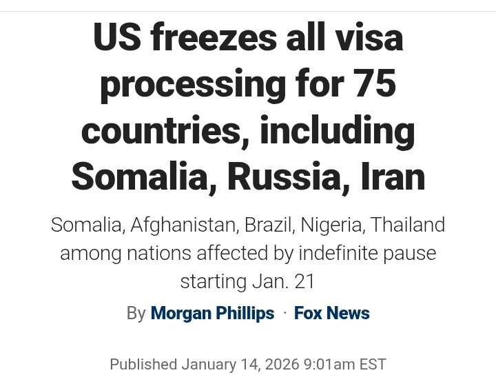 "SHBA-të ngrijnë të gjitha procedurat e vizave për 75 vende, përfshirë Somalinë, Rusinë dhe Iranin. Somalia, Afganistani, Brazili, Nigeria dhe Tajlanda janë ndër vendet e prekura nga pauza e pacaktuar duke filluar nga 21 janari", thuhet në titullin qendror të rrjetit televiziv amerikan Fox News.