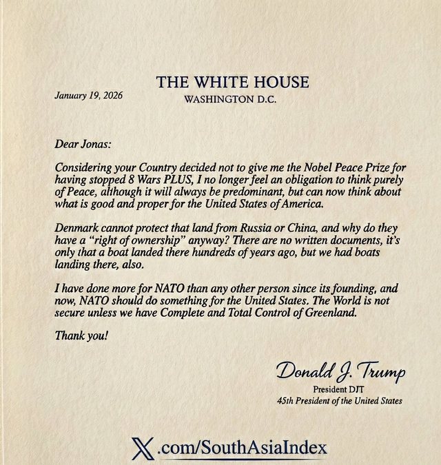 Donald Trump, i ka dërguar një letër kryeministrit norvegjez Jonas Gahr Støre, ku shpreh zhgënjimin e tij për mosdhënien e Çmimit Nobel për Paqen dhe shkruan për interesin ndaj Groenlandës.