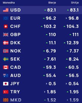 Euro blihet me 96.2 lekë dhe do të shitet me 96.8 lekë.
