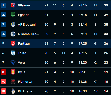Vetëm 7 pikë e ndajnë Partizanin nga zona e ftohtë, që për të kuqtë është diferencë e barabartë edhe me Dinamon e vendit të katërt. Një situatë që alarmon skuadrën e kryeqytetit, e cila po kalon një moment të vështirë në garë.