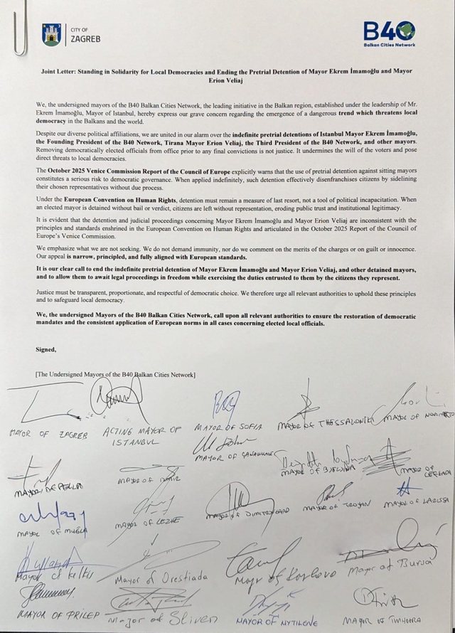 Tiranë / Stamboll – Kryetarët e 76 bashkive anëtare të Rrjetit të Qyteteve të Ballkanit B40 kanë shprehur shqetësim të thellë për mbajtjen në paraburgim pa afat të Kryetarit të Bashkisë së Stambollit, Ekrem Imamoglu, dhe Kryetarit të Bashkisë së Tiranës, Erion Veliaj, duke e cilësuar këtë praktikë si një trend të rrezikshëm që cenon demokracinë vendore në Ballkan dhe më gjerë.