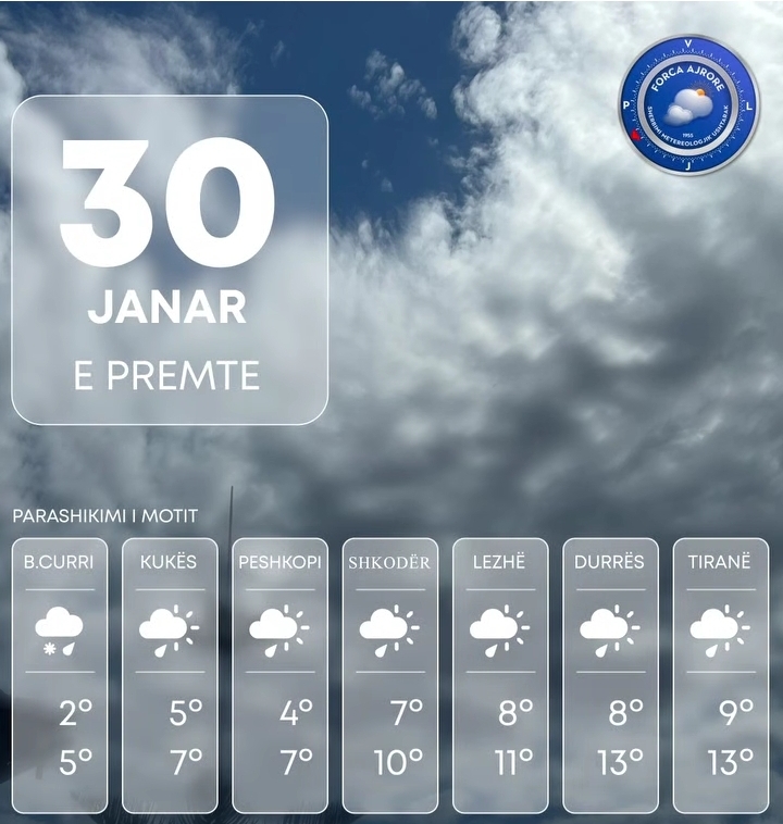 🌦️Për ditën e premte vendi ynë pritet të vijojë të ndikohet nga kushte atmosferike të paqëndrueshme.