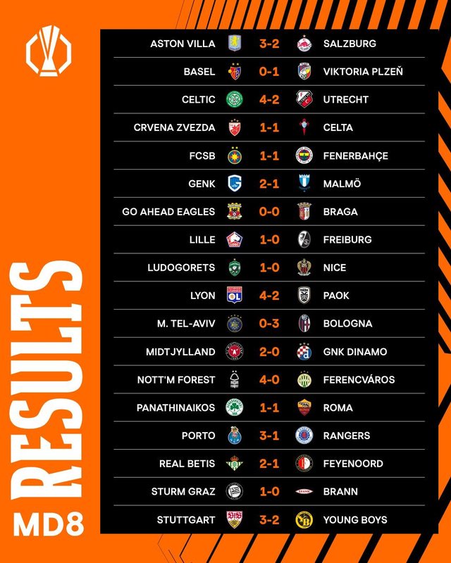 Nga ana tjetër, Bologna nuk përfitoi nga fitorja 3-0 ndaj Maccabi Tel Aviv, duke u detyruar të luajë në fazën play-off. Edhe Braga barazoi 0-0 ndaj Go Ahead Eagles, skuadër tashmë e eliminuar.