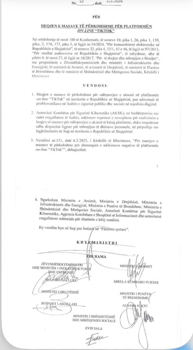 Tiranë, 4 shkurt 2026 – Qeveria e Shqipërisë ka vendosur të heqë masat e përkohshme që ndaluan aksesin në rrjetin social TikTok, i cili ishte i bllokuar në të gjithë territorin që nga 13 marsi 2025.