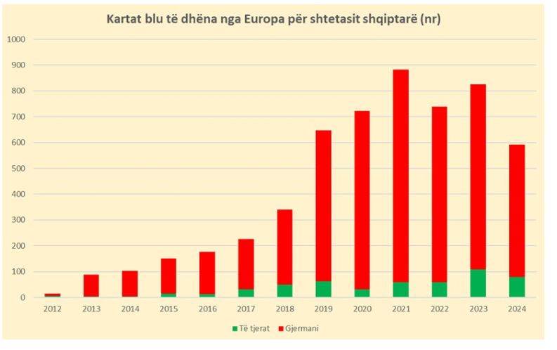 Sipas të dhënave të Eurostat, nga viti 2014 deri në vitin 2024 janë dhënë gjithsej 5 405 Karta Blu për shtetasit shqiptarë. Rritja më e fortë vërehet pas vitit 2019, periudhë që përkon me një valë emigracioni të profesionistëve të kualifikuar.