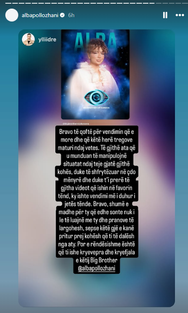 Pas daljes nga Big Brother VIP Kosova, Alba ka reaguar përmes rrjeteve sociale, duke shpërndarë një postim mbështetës nga Yll Dreshaj, ish-banor i “Ferma VIP”.