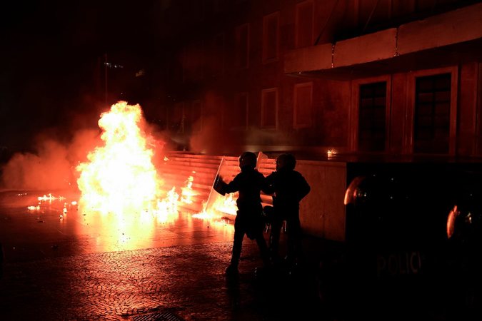 Incidenti ndodhi në momentet kur disa protestues hodhën molotovë dhe lëndë piroteknike drejt perimetrit të sigurisë përreth Kuvendit, duke shkaktuar flakë dhe tym në zonë.