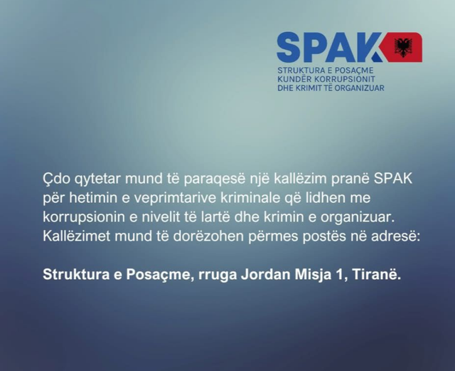 TIRANË – Struktura e Posaçme Kundër Korrupsionit dhe Krimit të Organizuar (SPAK) ka publikuar një njoftim zyrtar për qytetarët, duke i ftuar ata të denoncojnë rastet e korrupsionit të nivelit të lartë dhe krimit të organizuar.