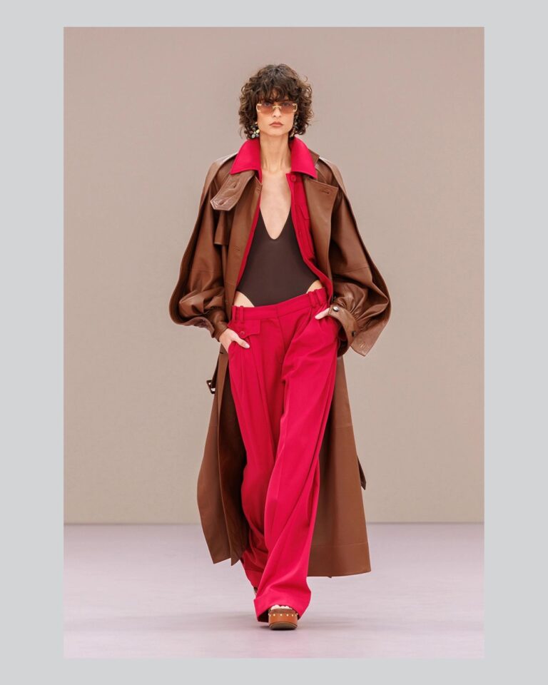 Veshja monokromatike nuk do të thotë tone neutrale. Në pasarelën e Zimmermann, pantallonat e kuqe me prerje të lirshme që bien deri në tokë krijojnë një pamje moderne dhe luksoze pa sforcim. Një nuancë e vetme mjafton për të bërë deklaratë.