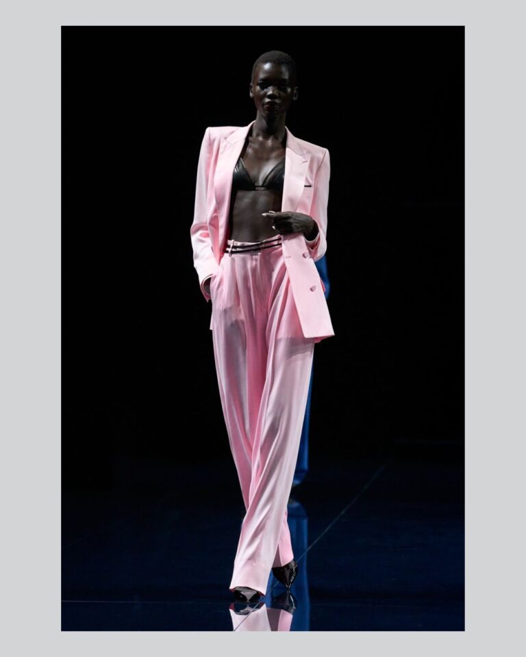 Nën drejtimin kreativ të Haider Ackermann për Tom Ford, rozë e butë merr një dimension të ri. Pantallonat me bel të lartë dhe linja të pastra kombinojnë frymën e viteve ’80 me elegancë bashkëkohore.