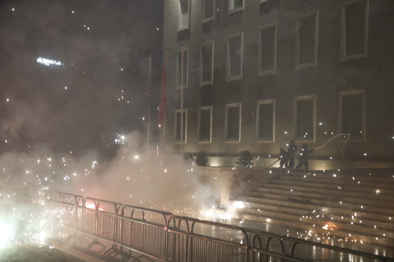 Pas përfundimit të fjalës së kryetarit të Partia Demokratike e Shqipërisë, Sali Berisha, një pjesë e protestuesve hodhën mjete piroteknike dhe shishe me lëndë ndezëse në drejtim të godinës së Kryeministrisë.