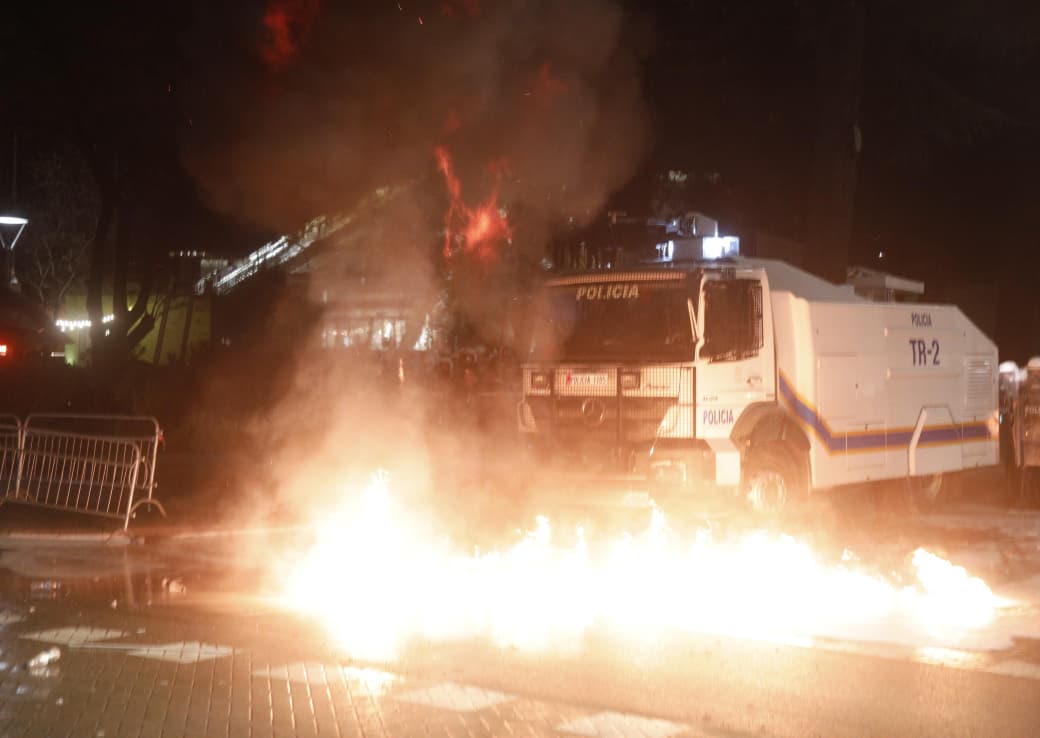 Si pasojë, në hyrje të godinës u shfaqën flakë, ndërsa forcat e policisë ndërhynë menjëherë duke përdorur ujë për shuarjen e zjarrit dhe për shpërndarjen e personave të përfshirë në incidente.