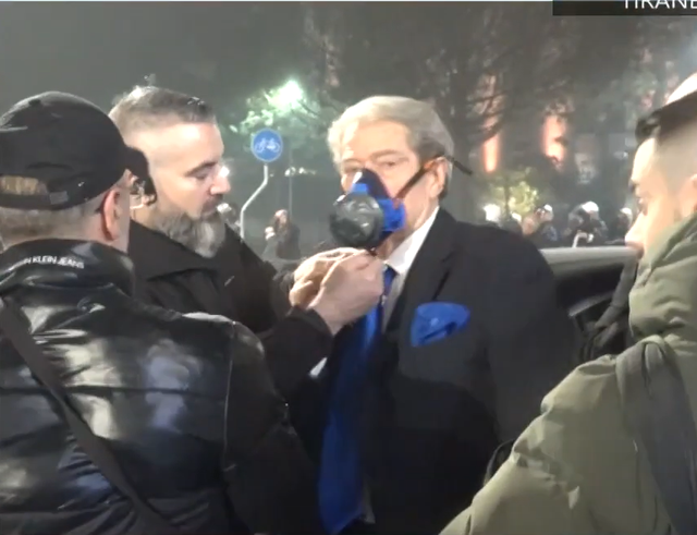 Detaj ndryshe këtë të premte është fakti se Berisha me maskë kundër gazit, vendosi të qëndrojë me protestuesit.
