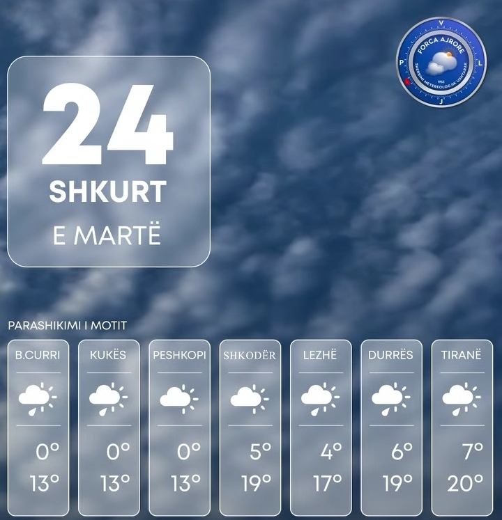 Moti parashikohet me alternime kthjellimesh dhe vranësira të cilat hera-herës priten të jenë deri të dendura këtë të martë 24 shkurt 2026, raporton noa.al duke cituar Shërbimin Meteorologjik Ushtarak.