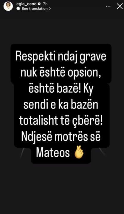 Fituesja e edicionit të tretë të “Big Brother VIP”, Egla Ceno, reagoi ashpër përmes një postimi në “Instastory”, duke kërkuar ndjesë për motrën e Mateos. Ajo theksoi se respekti ndaj grave nuk është opsion, por themel, dhe kritikoi sjelljen e banorit: “Respekti ndaj grave nuk është opsion, është bazë! Ky sendi e ka bazën totalisht të çbërë! Ndjesë motrës së Mateos ????”