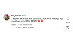 Vëmendje të veçantë ka tërhequr komenti i motrës së tij, Ana Kallaku, në postimin ku shfaqet çifti. Mesazhi i saj është interpretuar nga ndjekësit jo vetëm si një urim për vëllain, por edhe si një deklaratë me nënkuptim.