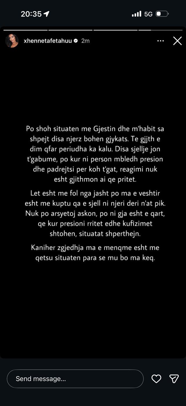 Përmes një postimi në rrjetin social Instagram, Xheneta ka kërkuar më shumë mirëkuptim nga publiku, duke theksuar se nuk po justifikon sjelljet e gabuara, por se presioni i gjatë dhe grumbullimi i padrejtësive mund të çojnë në reagime të papritura.