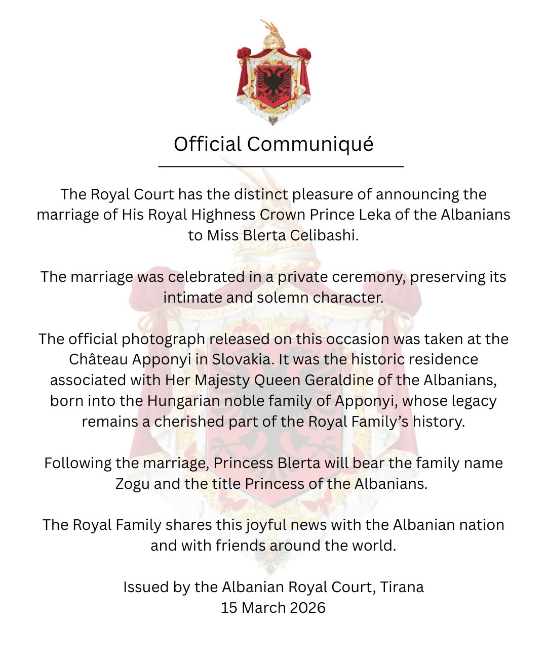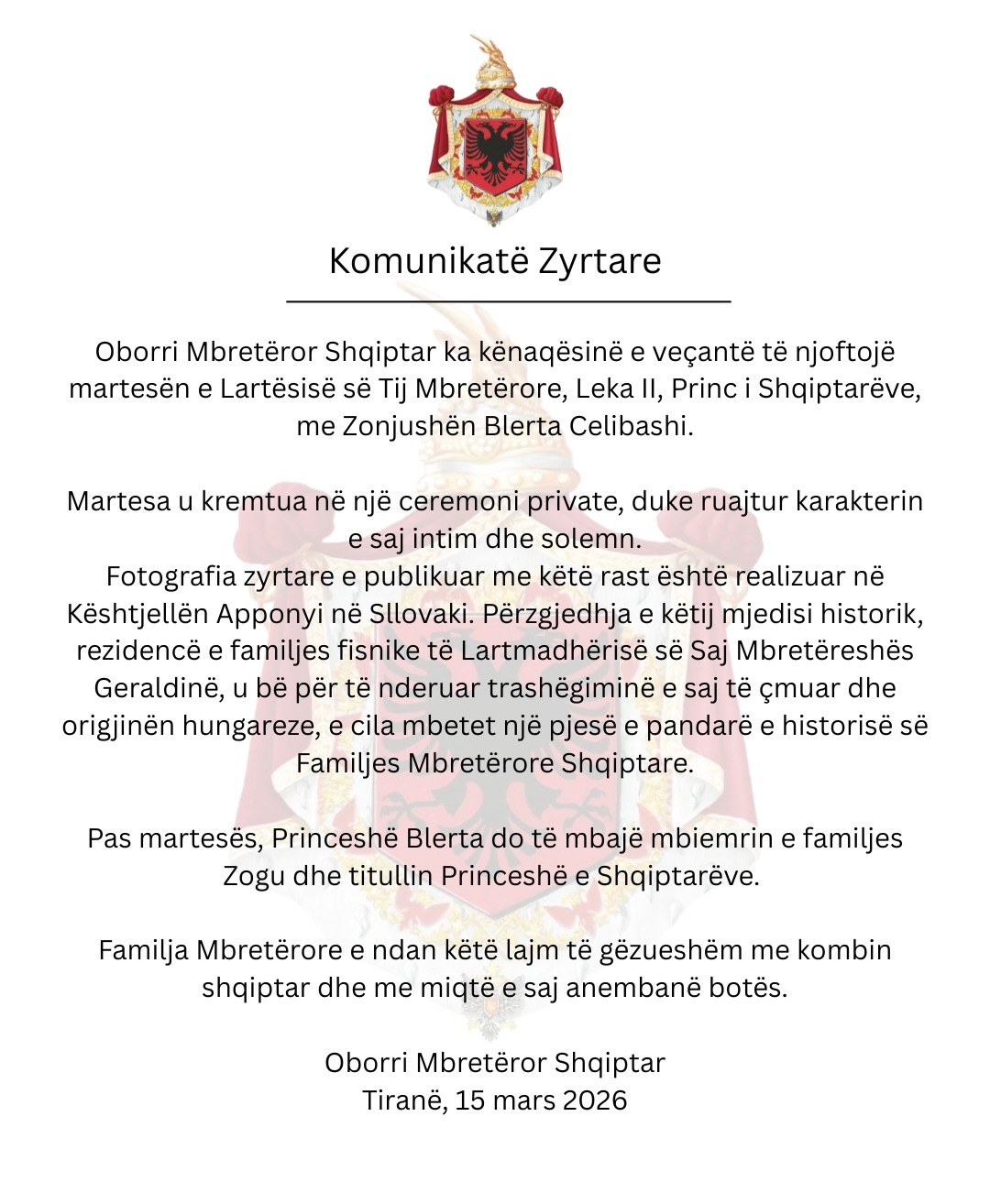 Tiranë, 15 mars 2026 – Oborri Mbretëror Shqiptar ka njoftuar zyrtarisht martesën e Leka II Zogu, Princ i Shqiptarëve, me Blerta Celibashin.