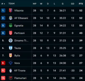 KF Vora ka po aq pikë sa Bylisi, ndërsa KF Tirana renditet me pikë të barabarta me Flamurtarin, duke e bërë luftën për mbijetesë një nga më të fortat e sezonit.