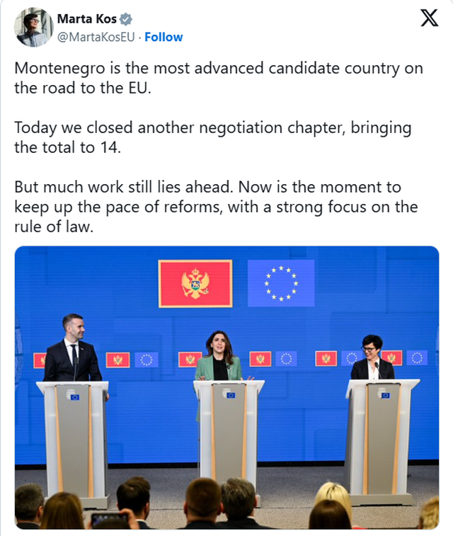 Komisionerja e BE për Zgjerimin, Marta Kos, ka theksuar se Mali i Zi është vendi kandidat më i përparuar në rrugën drejt BE-së.