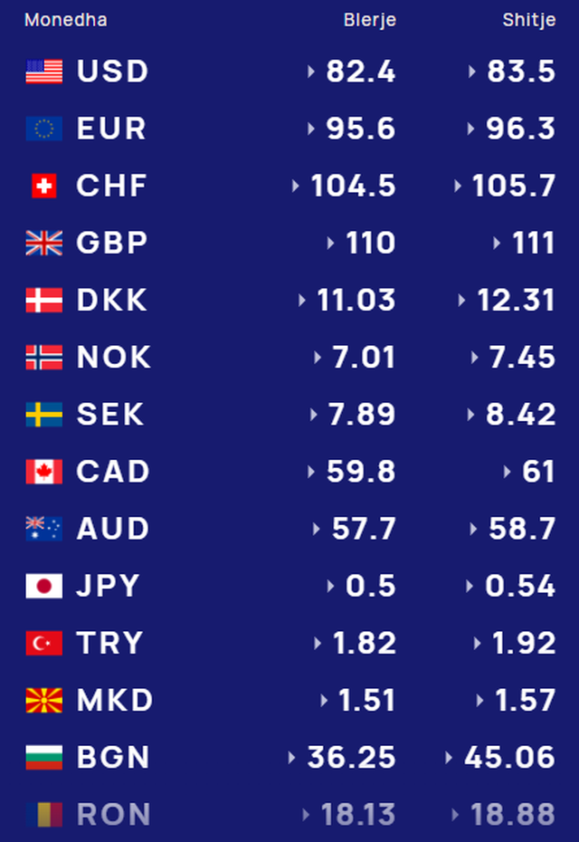 Për kursin e monedhave të tjera shihni tabelën e mëposhtme: