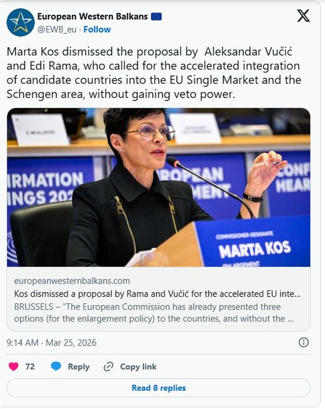 Komisionerja e BE-së për Zgjerim, Marta Kos, ka hedhur poshtë propozimin e kryeministrit shqiptar, Edi Rama, dhe presidentit serb, Aleksandar Vuçiç, për përshpejtimin e integrimit të vendeve kandidate në tregun e përbashkët të BE-së dhe në hapësirën Shengen, pa marrë të drejtën e vetos nga vendet anëtare.