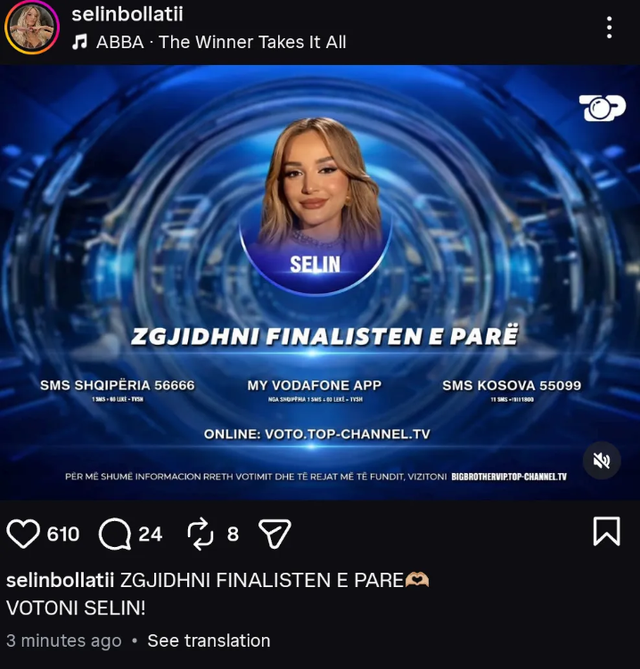 Postimi shoqërohet me këngën e njohur të grupit ABBA, “The Winner Takes It All”, një mesazh simbolik i mbështetjes së familjes dhe synimit për fitoren e Selinës në këtë edicion.