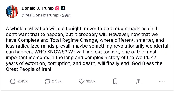 Donald Trump ka postuar në Truth Social, duke paralajmëruar: "Një qytetërim i tërë do të vdesë sonte, për të mos u rikthyer kurrë më."