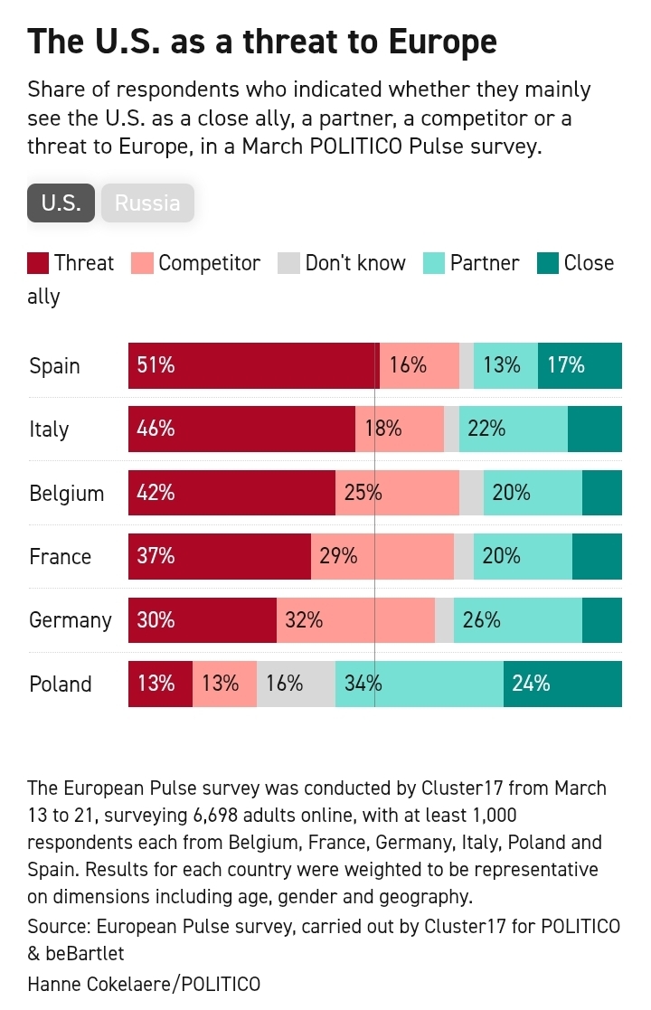 Spanja rezulton vendi më kritik ndaj SHBA-së, ku 51% e të anketuarve e konsiderojnë një kërcënim. Në Itali kjo shifër është 46%, në Belgjikë 42%, në Francë 37% dhe në Gjermani 30%. Përjashtim bën Polonia, ku vetëm 13% e shohin SHBA-në si rrezik, për shkak të varësisë së saj nga aleanca me Uashingtonin për siguri.