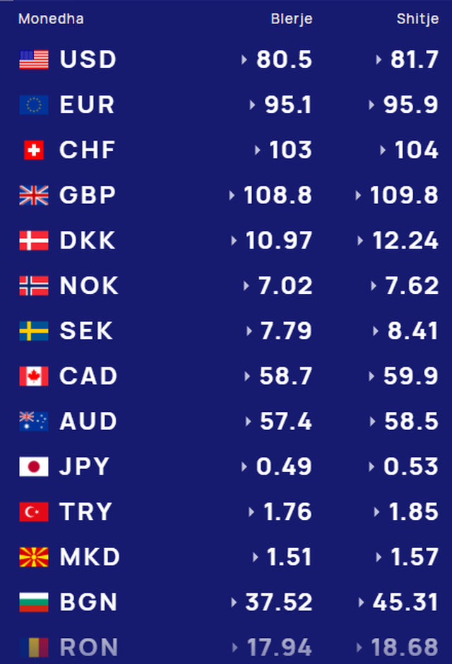Sipas të dhënave të fundit, dollari amerikan blihet me 80.5 lekë dhe shitet me 81.7 lekë. Ndërkohë, euro këmbehet në blerje me 95.1 lekë dhe në shitje me 95.9 lekë, duke mbetur një nga monedhat më të qëndrueshme në treg.