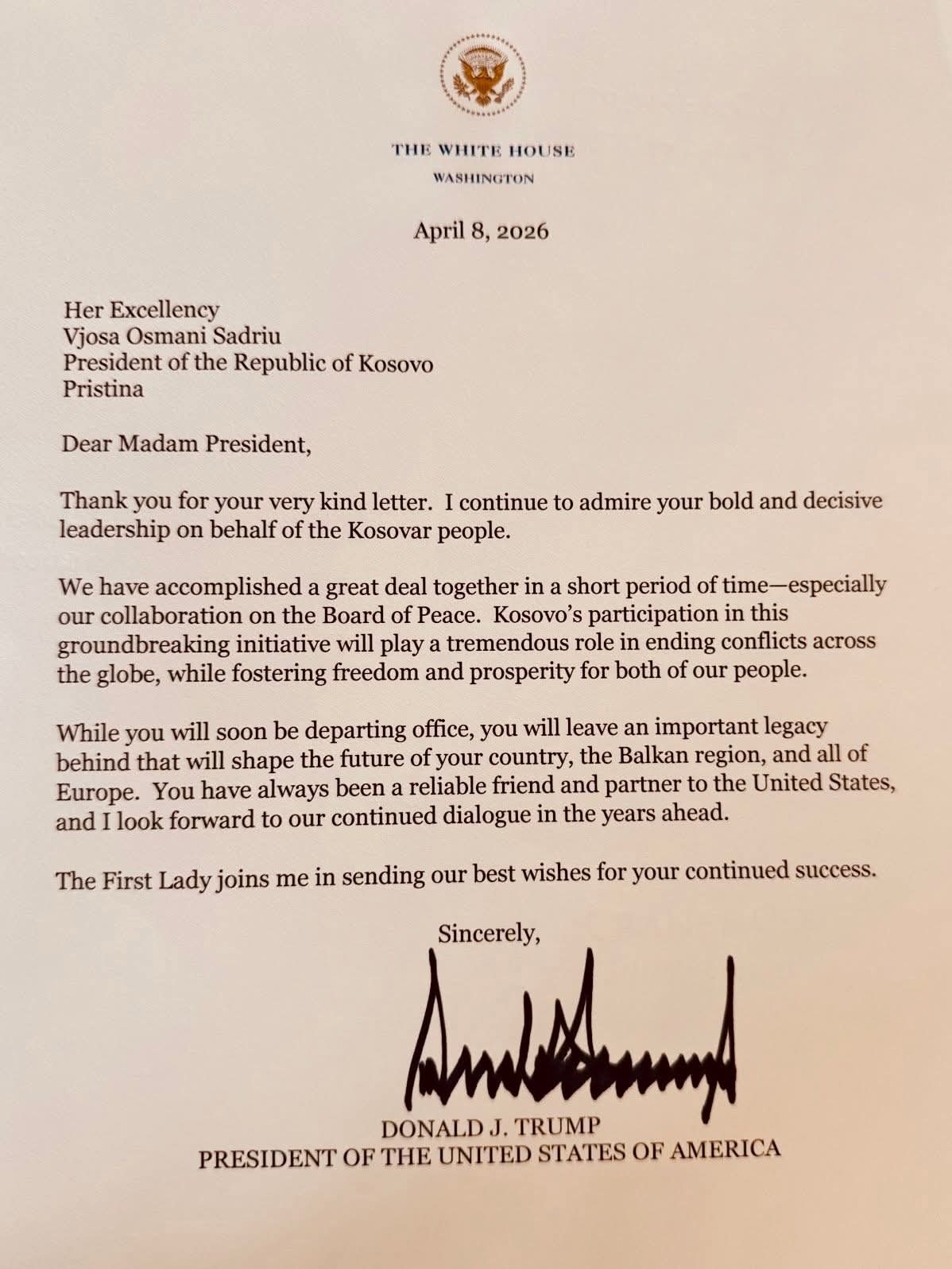Falënderoj Presidentin Trump për letrën e dërguar në përfundim të mandatit tim, të cilën e pranova mbrëmë, si dhe për vlerësimin që i ka bërë punës sonë! Ashtu siç thekson edhe Presidenti i SHBA-ve në këtë letër, mirëpresim vazhdimin e bashkëpunimit në vitet në vijim.