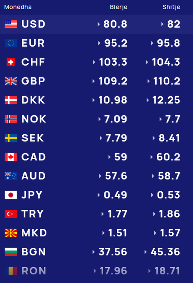 Sipas të dhënave të fundit, dollari amerikan blihet me 80.8 lekë dhe shitet me 82 lekë. Ndërkohë, euro vijon të mbetet në nivele të qëndrueshme, duke u blerë me 95.2 lekë dhe duke u shitur me 95.8 lekë.